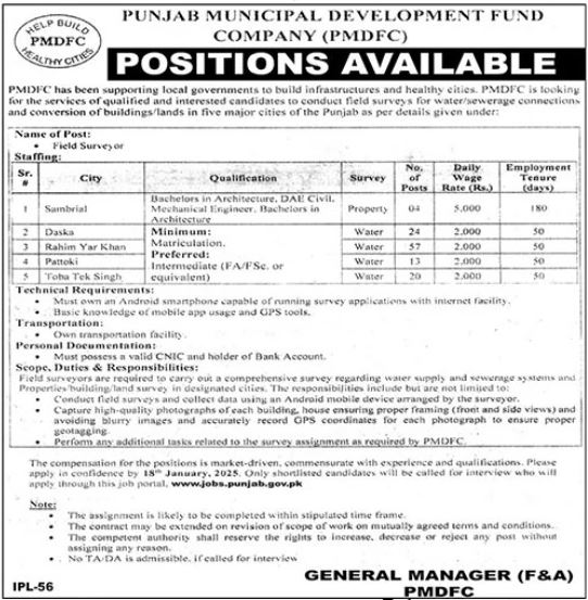 Punjab Municipal Development Fund Company PMDFC jobs advertisement dated about 9 January 2025 in daily The News Newspaper invites application for the vacant post of field surveyor in Lahore, toba tek singh, rahim yar khan, pattoki and daska Punjab Pakistan. Educational qualifications required Bachelor, Intermediate and DAE etc.