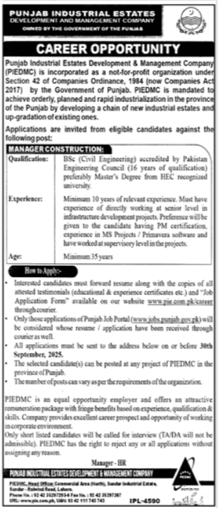 Vacant posts including manager construction are announced in Punjab Industrial Estates Development and Management Company PIEDMC Raiwind Road Lahore, lahore Punjab Pakistan as per 15 September 2025 advertisement in daily Jang Newspaper. Persons with Bachelor etc. education can apply.
