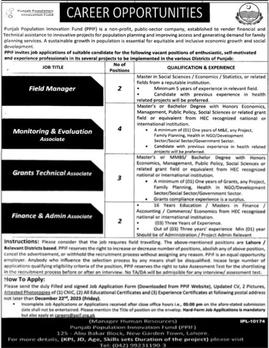 Punjab Population Innovation Fund PPIF latest Government Management jobs and others can be applied till 22 December 2023 or as per closing date in newspaper ad. Read complete ad online to know how to apply on latest Punjab Population Innovation Fund PPIF job opportunities.