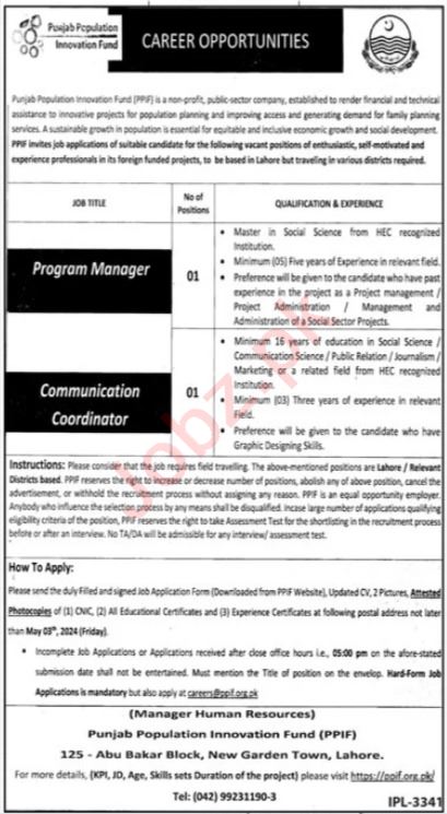 Punjab Population Innovation Fund PPIF jobs advertisement dated about 21 April 2024 in daily Jang Newspaper invites application for the vacant post of communication coordinator and program manager in Lahore, lahore Punjab Pakistan. Educational qualifications required Master etc.