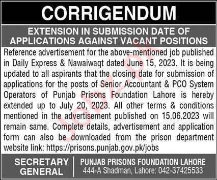 Punjab Prisons Foundation Lahore, lahore Punjab Pakistan invites applications from eligible candidates for the post of accountant and pco system operator as per advertisement of July 9, 2023 published in daily Express Newspaper. MS, Master, M.com and Bachelor etc. educational qualification will be preferred.