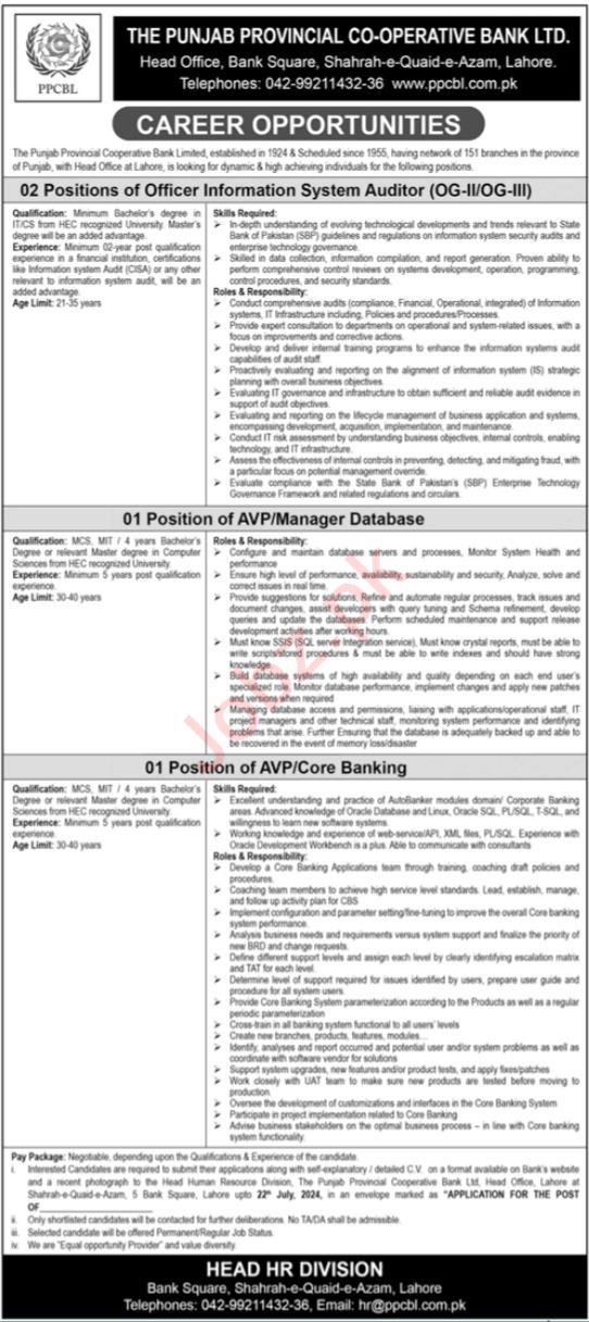 Vacant posts including avp core banking, officer information system auditor, avp manager database and avp manager are announced in The Punjab Provincial Cooperative Bank Limited Lahore, lahore Punjab Pakistan as per 7 July 2024 advertisement in daily Jang Newspaper. Persons with Bachelor and Master etc. education can apply.