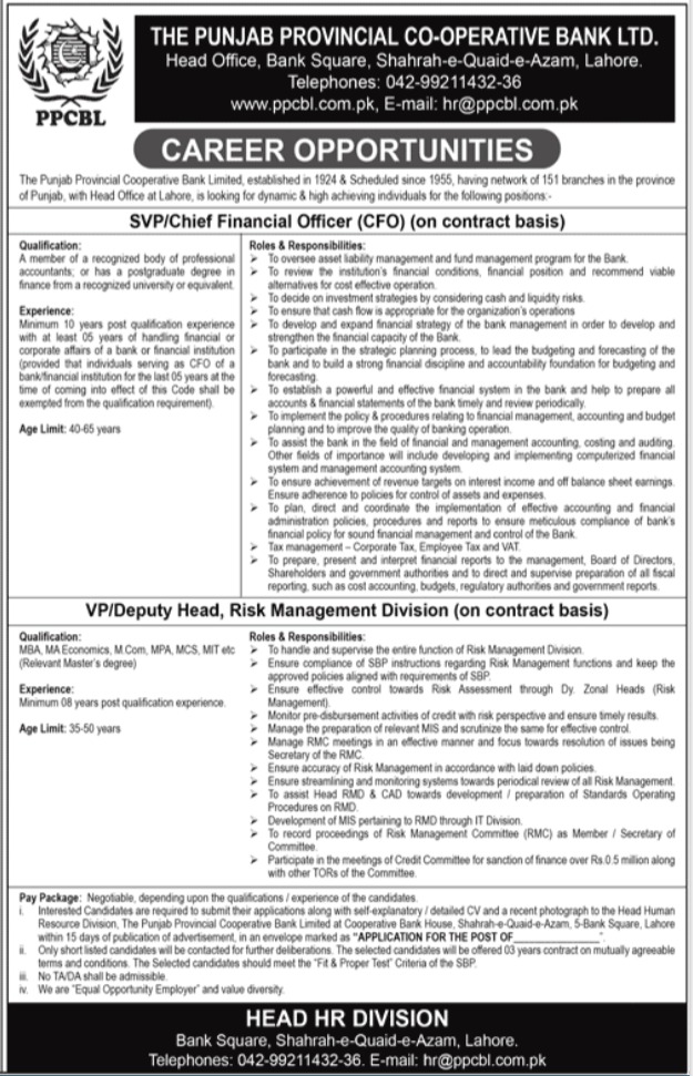 The Punjab Provincial Cooperative Bank Limited jobs advertisement dated about 7 May 2023 in daily Jang Newspaper invites application for the vacant post of deputy head risk management division, chief financial officer and cfo in Lahore, lahore Punjab Pakistan. Persons with M.com, Others, ACCA, Master, MIT, MA, MCS, CA and MBA etc. education can apply.