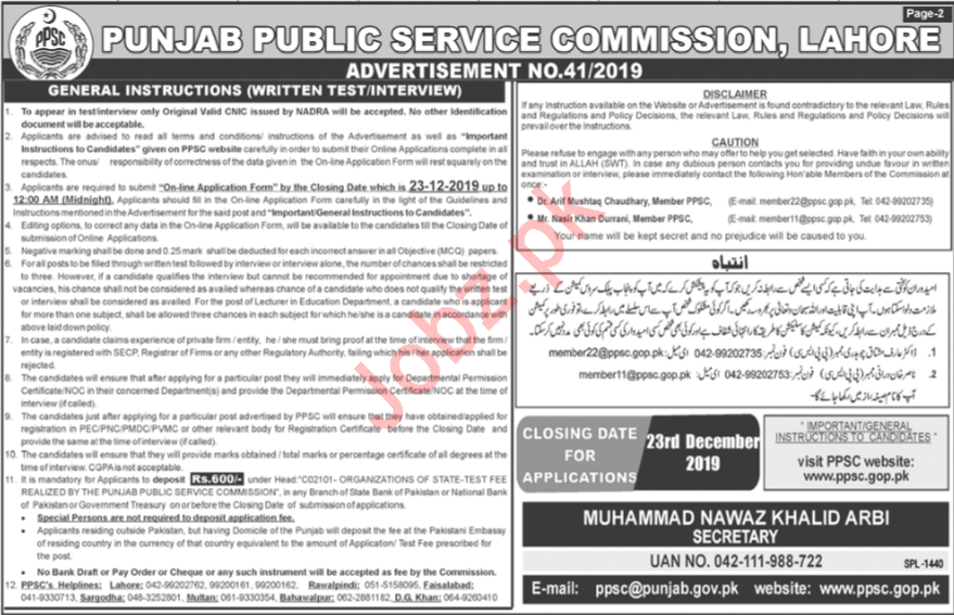 Vacancies in Punjab Public Service Commission PPSC Advertisement December 2019