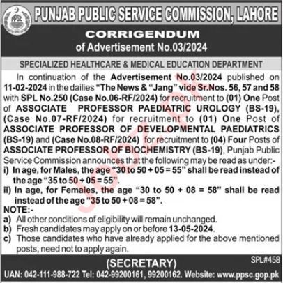 Punjab Public Service Commission PPSC jobs advertisement dated about 28 April 2024 in daily Jang Newspaper invites application for the vacant post of associate professor development paediatrics, associate professor, associate professor biochemistry and associate professor paediatric urology in Lahore, lahore Punjab Pakistan. Persons with Bachelor, Master, Phd and Mphil etc. education can apply.