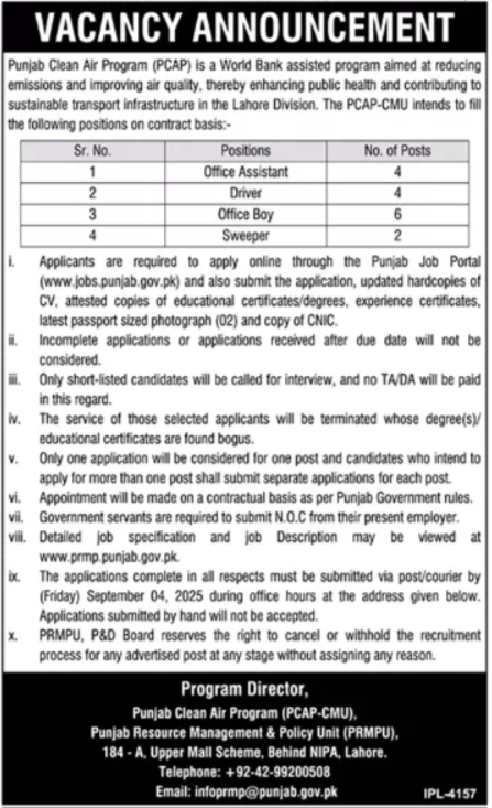 Vacancies in Punjab Resource Management Program Advertisement August 2025