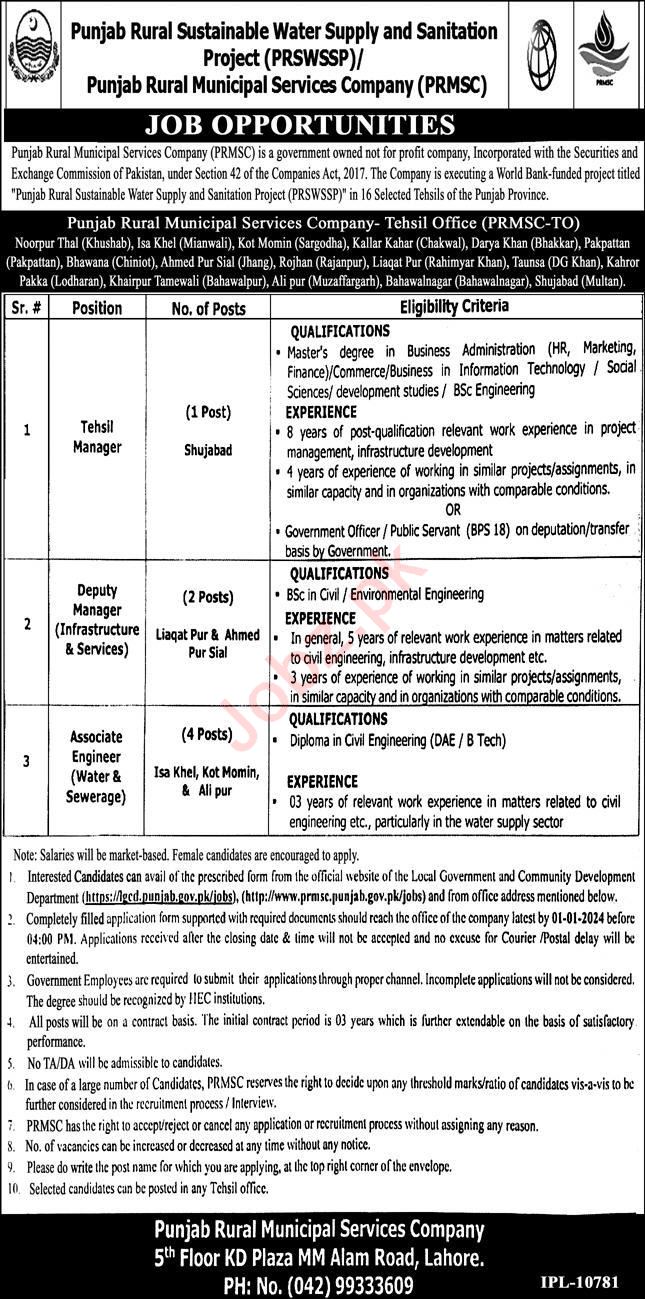 Vacancies in Punjab Rural Municipal Services Company Advertisement December 2023