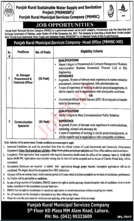 Punjab Rural Municipal Services Company jobs advertisement dated about 28 July 2024 in daily Jang Newspaper invites application for the vacant post of communication specialist and manager procurement contract officer in Lahore, lahore Punjab Pakistan. Preferred Education is LLb, Bachelor, Master and MS etc.