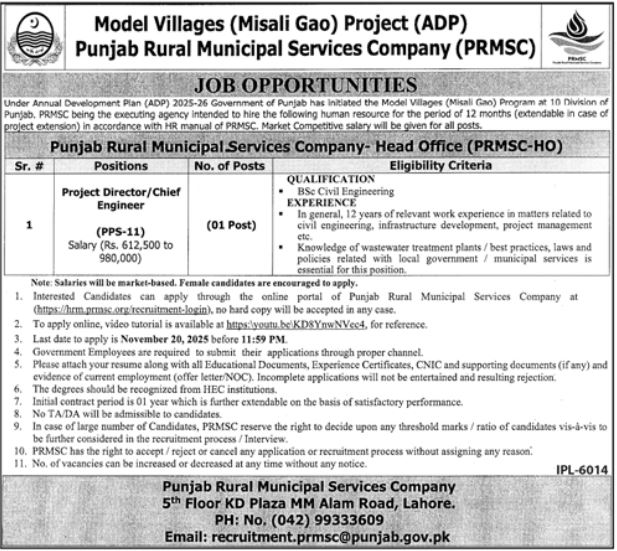 Punjab Rural Municipal Services company PRMSC is looking for candidates for following posts as per job advertisement published in daily Jang Newspaper of November 7, 2025 for location Lahore, lahore Punjab Pakistan: