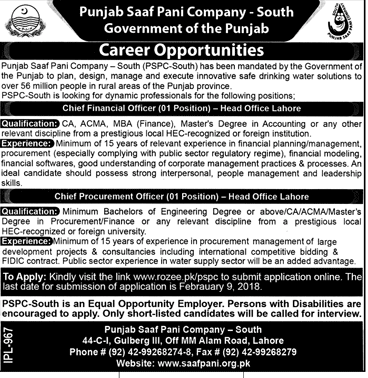 Latest Punjab Saaf Pani Company Management Posts Lahore 2025
