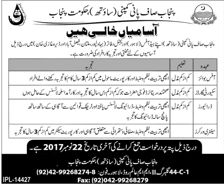 Latest Punjab Saaf Pani Company Security Posts Multan 2025