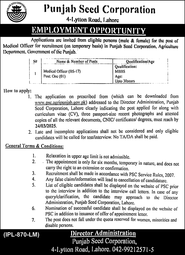 Vacant posts including medical officer are announced in Punjab Seed Corporation Lytton Road Lahore, lahore Punjab Pakistan as per 6 March 2025 advertisement in daily Nawaiwaqt Newspaper. Persons with MBBS etc. education can apply.