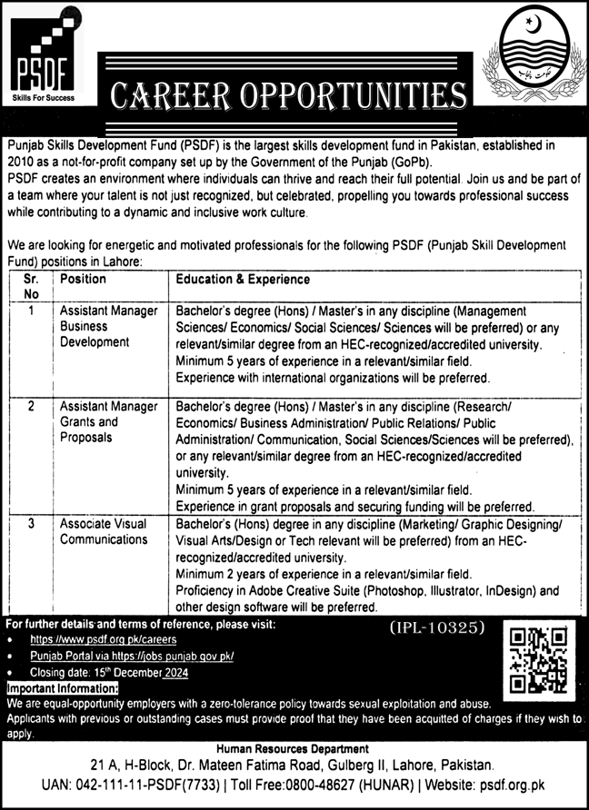 Punjab Skill Development Fund PSDF invites applications for job positions advertised in daily Nawaiwaqt dated 29 November 2024 for following vacancies in Lahore, lahore Punjab Pakistan.