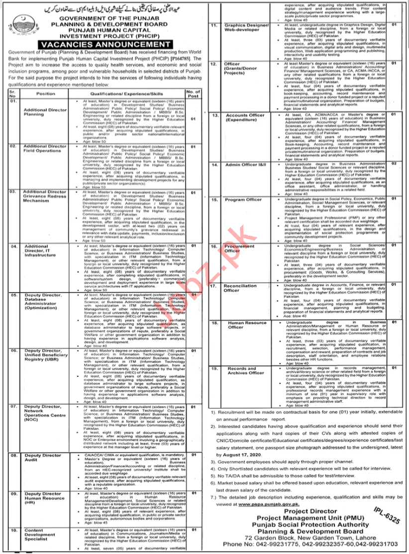 Project Management Unit, Punjab Social Protection Authority PSPA, Punjab Human Capital Investment Project PHCIP Lahore, Planning & Development Board, Government of the Punjab is looking experienced candidates for the posts of Additional Director, Additional Director Financial Management, Additional Director Payments, Financial Management Specialist, Additional Director Procurement, Procurement Specialist, Environmental Specialist, Social Safeguards Specialist, Communication Specialist, Monitoring Specialist.