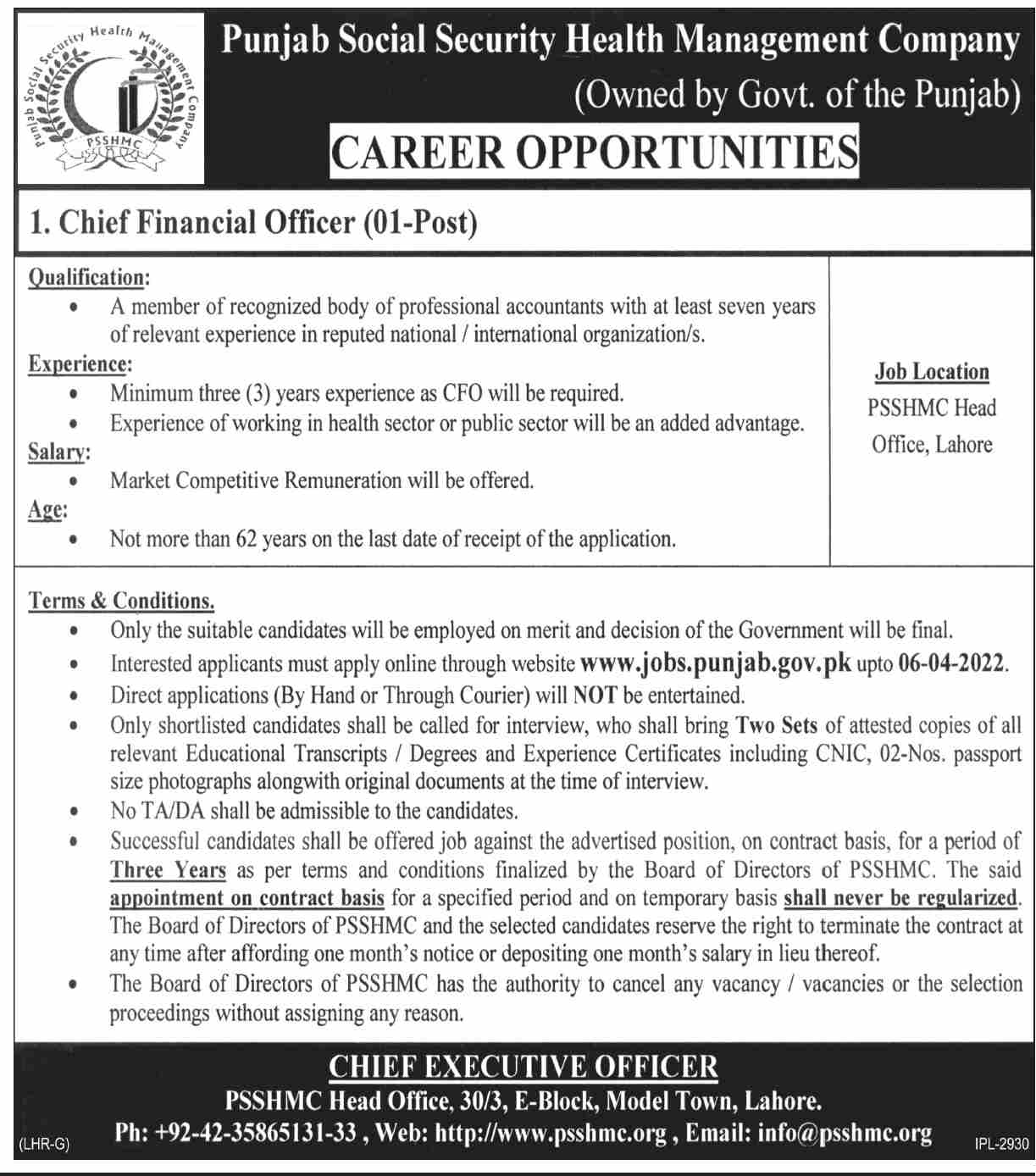 Punjab Social Security Health Management Company PSSHMC jobs advertisement dated about 19 March 2022 in daily Dawn Newspaper invites application for the vacant post of chief financial manager cfo in Lahore, lahore Punjab Pakistan. Persons with M.com and MBA etc. education can apply.