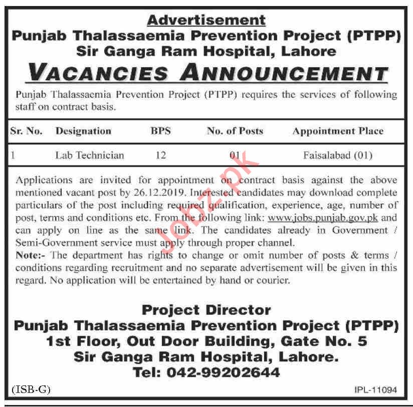 Punjab Thalassaemia Prevention Programme PTPP Lahore Jobs
