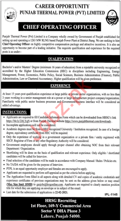Punjab Thermal Power Lahore Jobs 2021 For COO