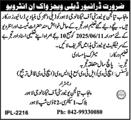 Punjab Tianjin University of Technology PTUT Township Lahore, lahore Punjab Pakistan invites applications from eligible candidates for the post of driver as per advertisement of May 30, 2025 published in daily Jang Newspaper. Persons with Middle, Matric and Primary etc. education can apply.