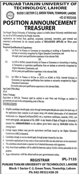 Punjab Tianjin University Of Technology Treasurer Jobs 2023