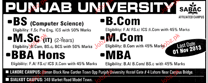 Punjab University Admission in BS, BlCom, MBA, BBA and MSc in Lahore Read newspaper ad for exact details.