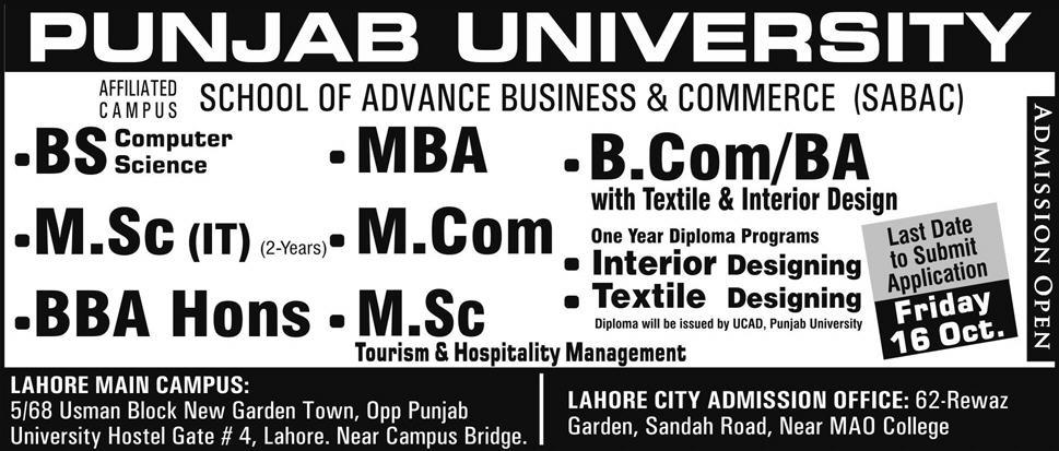 Punjab University Admission in BS, MBA, MSc, BBA and B.Com in Lahore. Read newspaper ad for exact details.