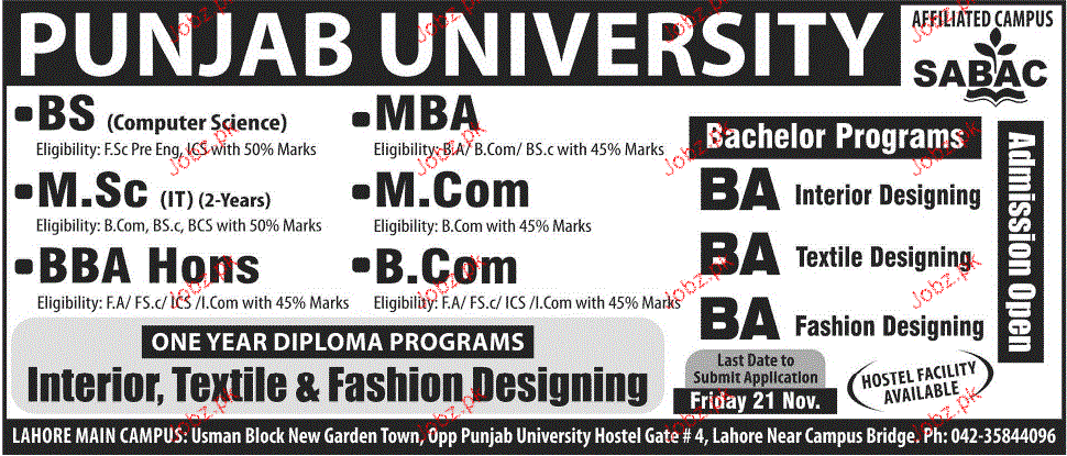 Punjab University Admission in BS, MBA, MSc, B.Com and BBA in Lahore. Read newspaper ad for exact details.