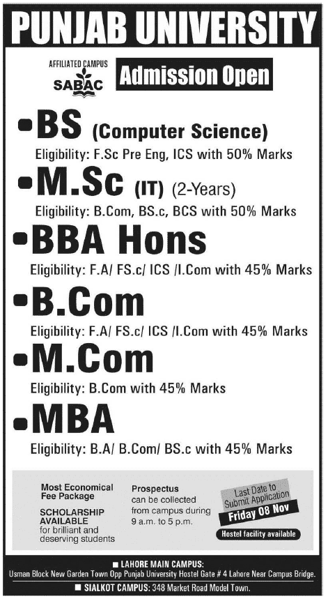 Punjab University Admission in BS, MSc, BBA, BCom and MBA in Lahore Read newspaper ad for exact details.