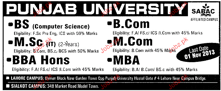 Punjab University Admission in BS, MSc, BCom, MBA and BBA in Lahore Read newspaper ad for exact details.