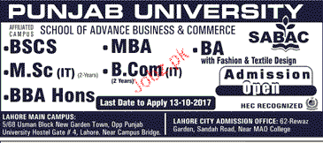 Punjab University Admission in BSCS, MSc and MBA in Lahore. Read newspaper ad for exact details.