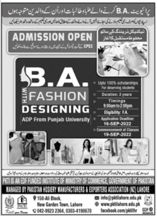 Punjab University Bachelor of Arts in Fashion Design. admissions 2022 has been announced. Eligible students can apply for academic admissions 2022 in Punjab University Lahore Punjab Pakistan for Fashion University. Students for admissions in Bachelor can apply for online or campus classes as per Private institute criteria till admission closing date September 16, 2022. Read newspaper ad for exact details.