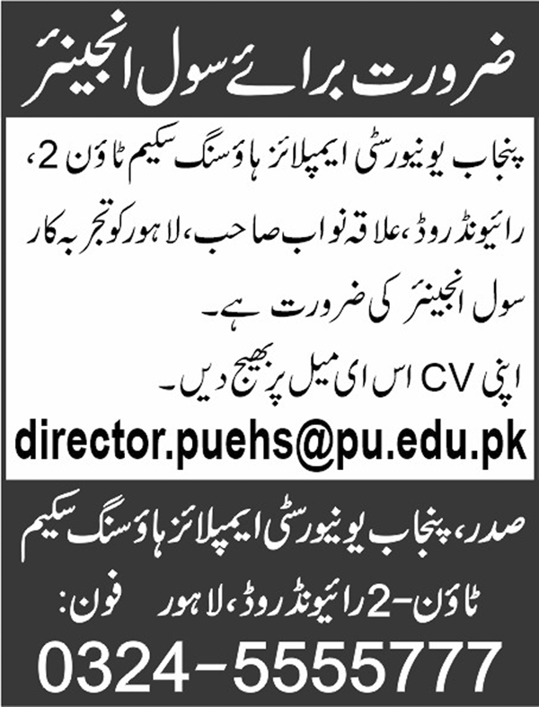 Latest Punjab University Housing Scheme Engineering Posts Lahore 2025