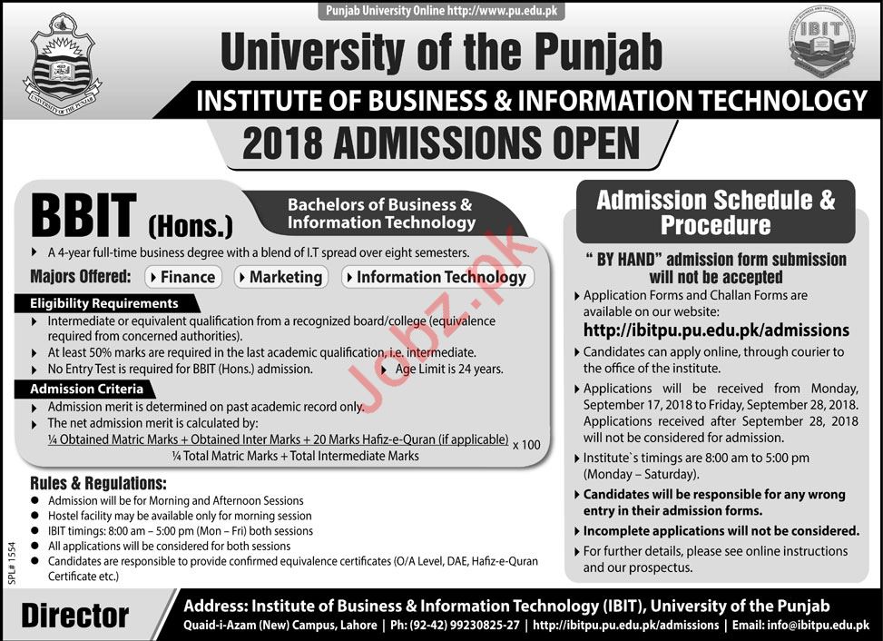 Punjab University PU Lahore, Government of the Punjab announced admissions fall 2018 for the classes of BBIT Hons (Finance, Marketing & Information Technology). Read newspaper ad for exact details.