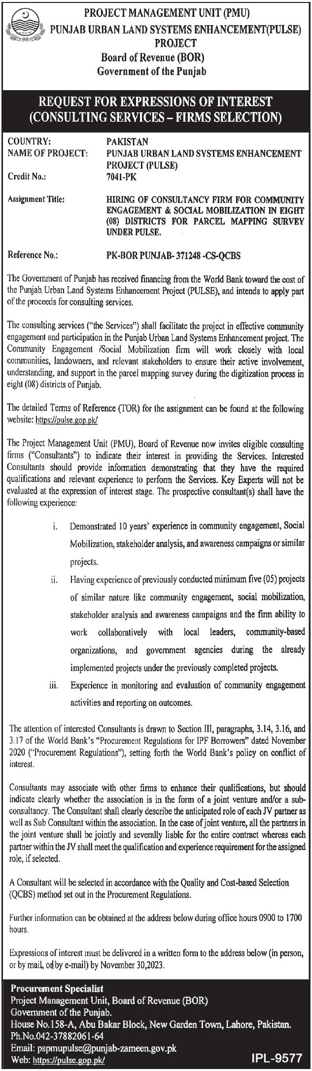 Board of Revenue Lahore, lahore Punjab Pakistan invites applications from eligible candidates for the post of consultant and social mobilization consultant as per advertisement of November 16, 2023 published in daily Express Tribune Newspaper. Educational qualifications required Bachelor and Master etc.