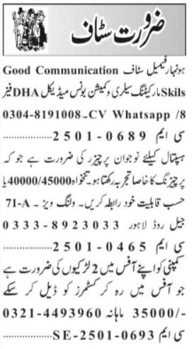 Private Company invites applications for job positions advertised in daily Jang dated 21 January 2025 for following vacancies in Lahore, lahore Punjab Pakistan.