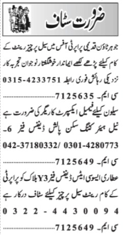 Private Company jobs advertisement dated about 17 November 2022 in daily Jang Newspaper invites application for the vacant post of worker, real estate agent, purchaser and beauty parlor staff in Lahore, lahore Punjab Pakistan. Middle, Bachelor, Intermediate and Matric etc. educational qualification will be preferred.