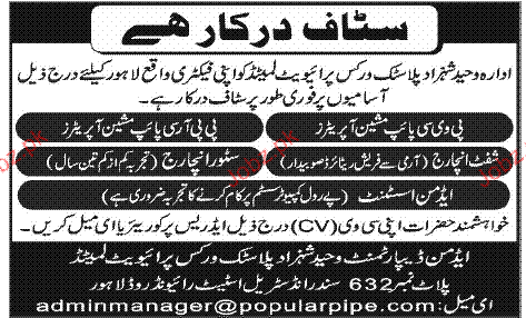 PVC Pipe Machine Operators, Admin Assistant Job Opportunity