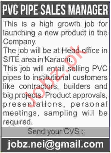 PVC Pipe Sales Manager Jobs 2018 In Karachi