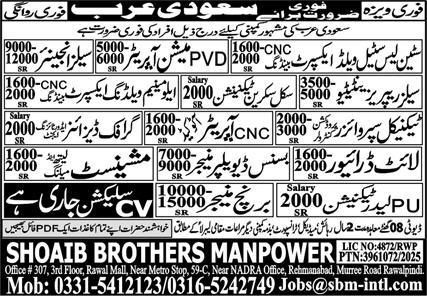 Shoaib Brothers Manpower Riyadh, dammam Saudi Arabia invites applications from eligible candidates for the post of machinist, skill screen technician, branch manager, ltv driver, cnc bending expert, light driver, lathe machine operator, sales representative, technical supervisor, driver, business development manager, pvd machine operator, stainless steel welder, autocad operator, pu leather technician, production controller, cnc operator, advertising agent, sales engineer, aluminum welding expert and graphic designer as per advertisement of September 9, 2025 published in daily Express Newspaper. Educational qualifications required Intermediate, Matric, BA, DAE, Bachelor, Others and B.E etc.