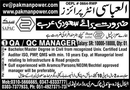 Al Abbasi Enterprises is looking for candidates for following posts as per job advertisement published in daily Express Newspaper of January 20, 2023 for location Dammam, riyadh Saudi Arabia: