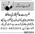 Education Lahore, lahore Punjab Pakistan invites applications from eligible candidates for the post of aalim, hafiz and qari as per advertisement of January 6, 2024 published in daily Dunya Newspaper. Educational qualifications required Others and Intermediate etc.