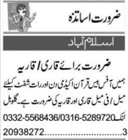 Quran Academy invites applications for job positions advertised in daily Express dated 5 July 2024 for following vacancies in Islamabad, islamabad Islamabad Pakistan.