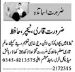 Educational Organization Lahore, lahore Punjab Pakistan invites applications from eligible candidates for the post of teacher, qari, hafiz, qariah and quran teacher as per advertisement of July 21, 2023 published in daily Dunya Newspaper. Candidates with Bachelor and Intermediate etc. educational background will be preferred.