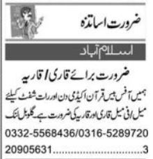Vacant posts including quran teacher, qariah, teacher and qari are announced in Global Link Communication Islamabad, islamabad Islamabad Pakistan as per 23 August 2023 advertisement in daily Express Newspaper. Candidates with Intermediate and Bachelor etc. educational background will be preferred.