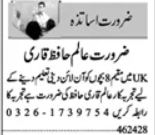 Vacant posts including qari are announced in Private Company Lahore, lahore Punjab Pakistan as per 4 June 2024 advertisement in daily Dunya Newspaper. Educational qualifications required Intermediate and Matric etc.