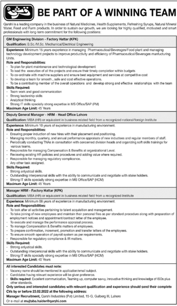 Qarshi Industries Pvt Limited is looking for candidates for following posts as per job advertisement published in daily Jang Newspaper of February 13, 2022 for location Lahore Punjab Pakistan: