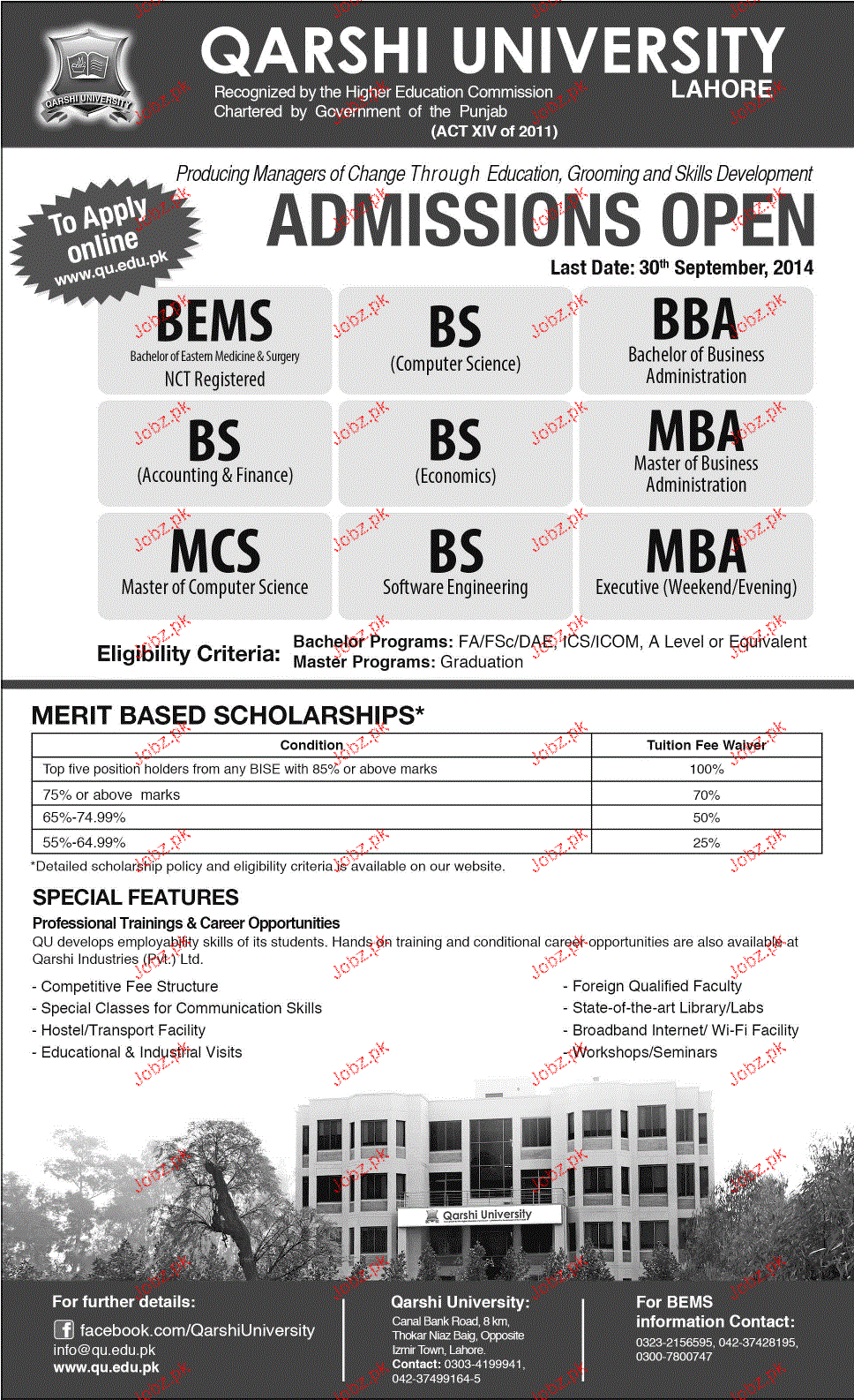 Qarshi University Admission in BEMS, BS, BBA, MBA and MCS in Lahore. Read newspaper ad for exact details.