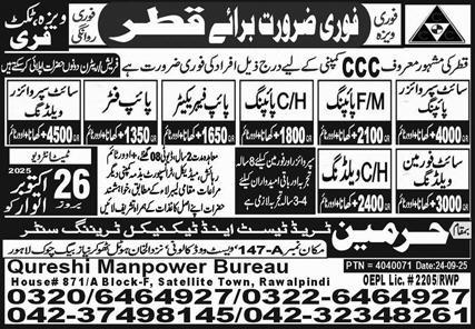 Vacant posts including Site Supervisor Piping, Pipe Fitter, Pipe Fabricator, Chargehand Welding, Site Foreman Welding, Chargehand Piping, Site Supervisor Welding and Foreman Piping are announced in Qureshi Manpower Bureau Qatar, qatar Qatar as per 20 October 2025 advertisement in daily Express Newspaper. Persons with Intermediate, Matric and Middle etc. education can apply.