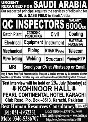 Best Human Resources Consultancy Jeddah, dammam Saudi Arabia invites applications from eligible candidates for the post of qc inspector as per advertisement of July 27, 2024 published in daily Express Newspaper. B.E, Bachelor and Intermediate etc. educational qualification will be preferred.