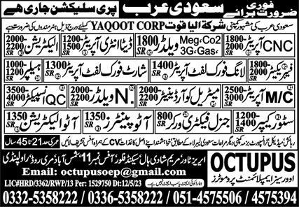 OCTOPUS Overseas Employment Promoters jobs advertisement dated about 13 May 2023 in daily Express Newspaper invites application for the vacant post of meg welder, fabricator, gas welder, electrician, general factory worker, short fork lift operator, cnc operator, auto electrician, 3g welder, helper, qc inspector, store keeper, co2 welder, welder, long fork lift operator, fork lift operator, data entry operator, n welder, auto painter and material coordinator in Dammam, riyadh Saudi Arabia. Persons with Intermediate, B.E, DAE, Matric and Bachelor etc. education can apply.