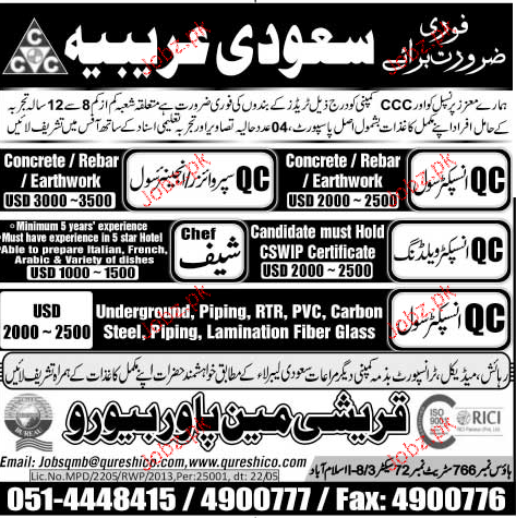 QC Inspectors, QC Civil, Chef Job Opportunity